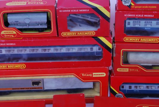 00 GAUGE: A collection of assorted vintage Triang Hornby 00 gauge rolling stock / railway accessories etc. To include: Carriages, wagons, track accessories, R217, R208, R102, R923 and others. All boxed.