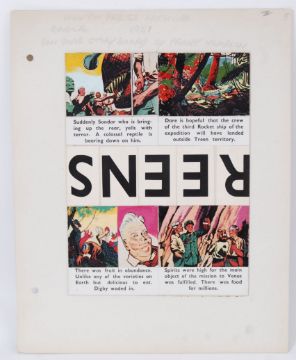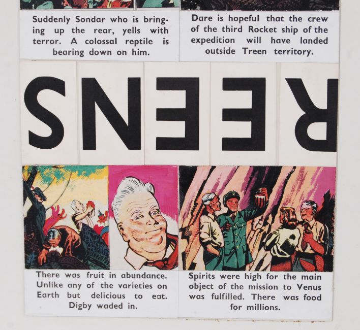 EAGLE DAN DARE ORIGINAL ARTWORK: An original Hulton Press Eagle Comics original artwork board for Dan Dare. c1951. Likely by Frank Hampson but artwork unsigned / unnamed. Featuring 4x artwork panels to the board with text underneath. Rare. 42cm x 33cm
