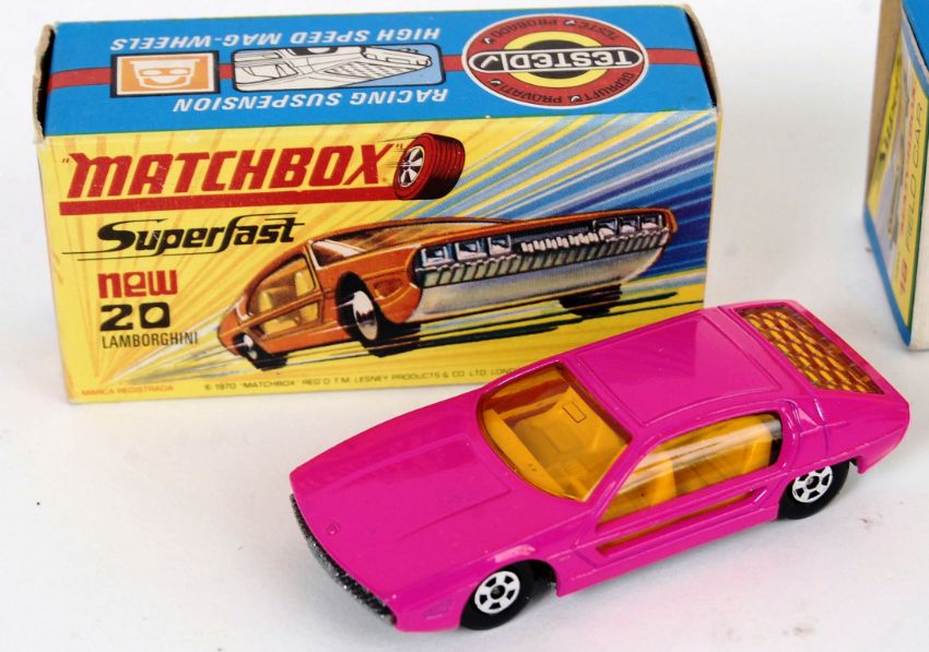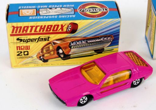 MATCHBOX SUPERFAST: A collection of three original vintage Matchbox Superfast diecast model cars. 20 Lamborghini Marzal, 52 Dodge Charger MkIII and 18 Field Car (1x paint chip). All otherwise mint+ condition models, within the original boxes. Rare in such condition.