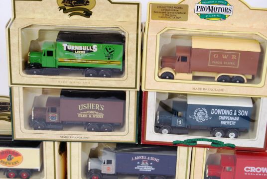CODE 3 LLEDO: A good collection of 10x Lledo Code 3 (custom non-standard livery) diecast models. All Scammels - Moles Brewery, House of Lord Scotch Whisky, Usher's Ales & Stouts, Dowding & Son Brewery, J. Arkell & Sons Brewery, Crown Movers, Geo. Newnes & Sons Publishers, W. Winwood & Son removals, Turnbulls Leeds, GWR Parcel Traffic. Each within the original boxes.