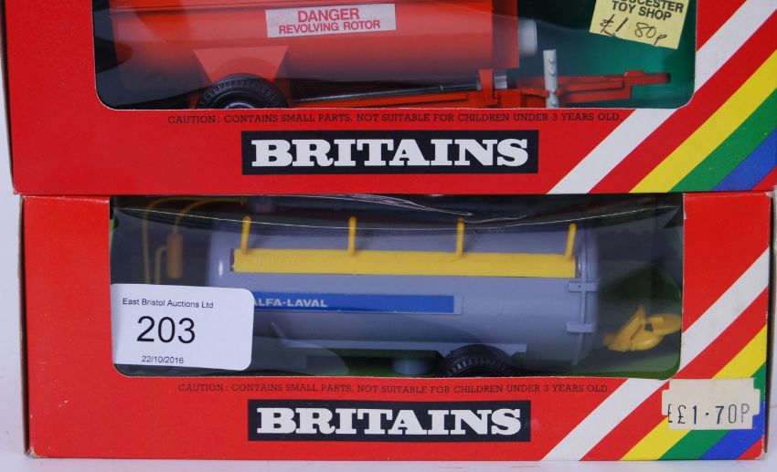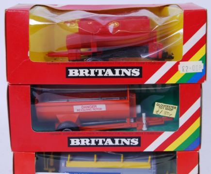 BRITAINS: A collection of 3x Britains Farm Implements diecast models - 9537 Spreader, 9568 Manure Spreader and 9560 Vacuum Tanker. All within the original boxes.