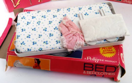 SINDY: A good collection of vintage 1960's Sindy by Pedigree boxed furniture / house accessories. To include Dressing Table & Stool, Wardrobe, Bed, Wardrobe Trunk, Chest Of Drawers etc. All within the original boxes. Mostly earlier versions. The Sindy Wardrobe being filled with assorted clothing outfits.
