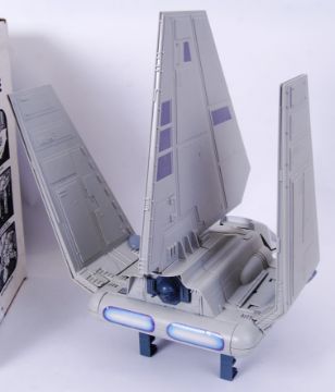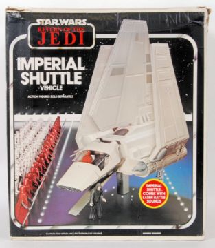 STAR WARS IMPERIAL SHUTTLE: A superb rare original vintage Star Wars Palitoy made ' Imperial Shuttle ' action figure playset vehicle. 100% complete. Comes in a very good original box, with inner card packing. The Shuttle itself with very little discolouration and very white. No damage, repairs or restoration, light use. 100% original. Difficult to find another in such condition. Rare. Often considered the 'holy grail' of the original Kenner line Star Wars toys.
