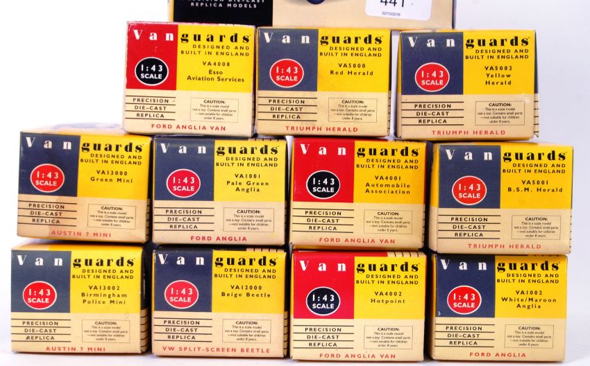 VANGUARDS: A collection of 12x precision diecast model Vanguards vehicles. All within the original boxes to include Volkswagen Beetle, Police, Mini, Ford Anglia, Triumph Herald, Limited Edition Ford Capri set etc.