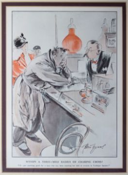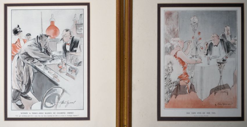 A pair of two framed and glazed Bert Thomas prints entitled The thin end of veg and Within a three mile radius of Charing Cross