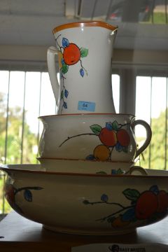 A 1930's Crown Ducal ceramic bathroom set comprising jug and bowl, chamber pot and other items all with transfer print floral spray design being stamped to the base