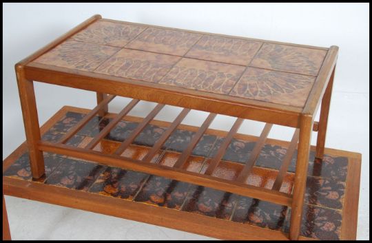 A pair of retro 1970's teak tiled topped coffee tables. One being stamped to the underside made in Denmark