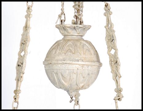 A 19th century French cast iron painted rise and fall chandelier light having lattice worked - fretted surround. Measures: 110cms high x 40cms wide x 40cms deep.