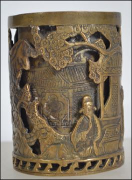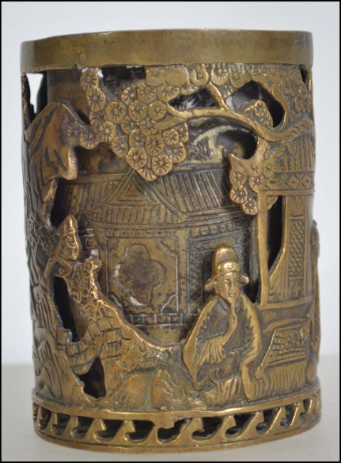 A Chinese double skin cast bronze brush pot Worked with figures mountain river landscape, with sixteen cast character mark to base.