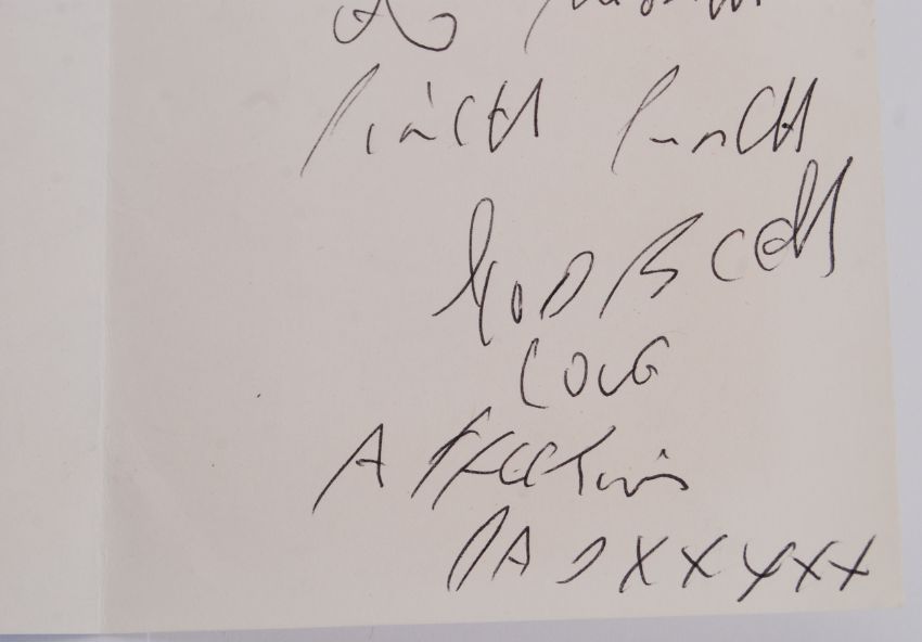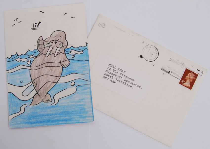 REG KRAY LETTER: An original greetings card written by Reg Kray to his adopted son, Brad. The card reading 'Brad, first day of the month, pinch punch, God Bless, love Dad XXXXX'. The top corner dated 1st October. With original envelope with postmark being 2nd October 1991. The greetings card itself appearing to be hand drawn and coloured in pen (not by Reg). Approx 6x4".