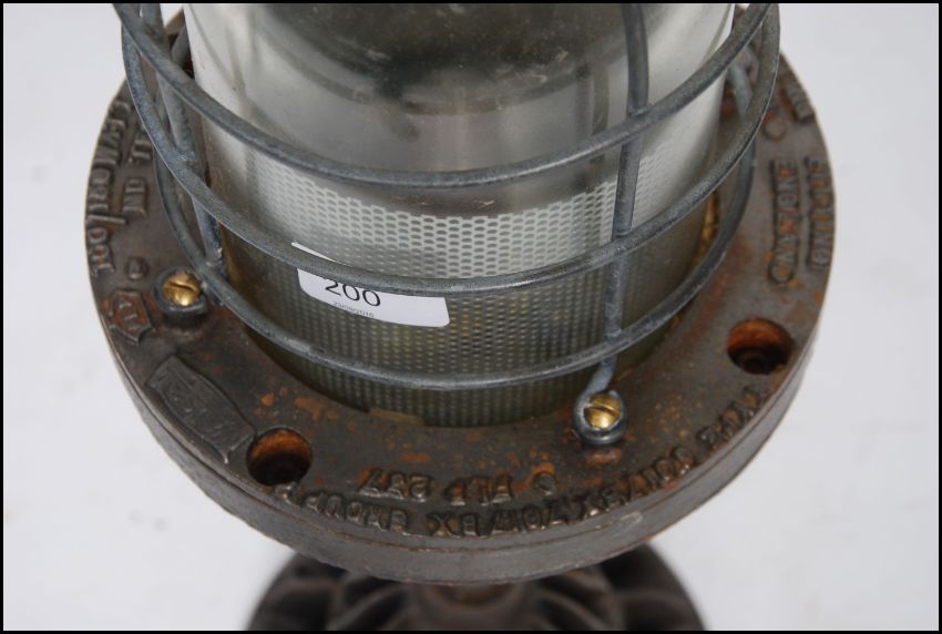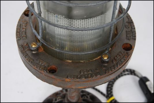 A stunning large desk mounted Industrial bulkhead table - desk lamp. The heavy base with large caged pendant shade atop of prismatic form. 56cm high