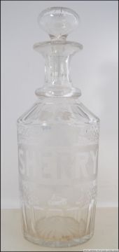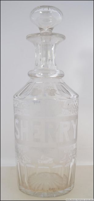 An early 20th century cut glass magnum sherry decanter with acid etched decoration complete with the stopper. Measures 32cms high