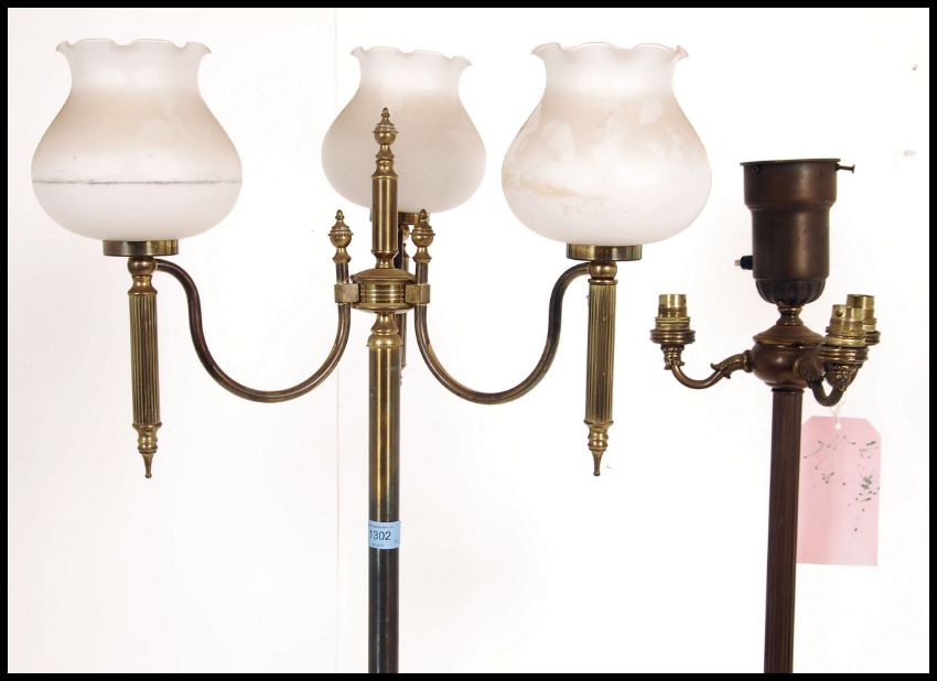 2 early 20th century standard lamps, one in brass and in the Art Nouveau manner together with another. Measures: 137cms high x 49cms wide x 49cms deep.