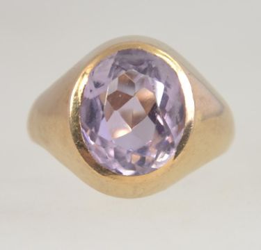 A hallmarked 9ct gold ladies dress ring with large amethyst stone. Bearing hallmarks for J M London Weighs 4.9 grams ring size N