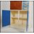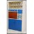 A retro 1950's two tone upright kitchen dresser having blue and wooden painted white upright body with glass sliding doors over cupboards. Measures: 178cms high x 90cms wide x 42cms deep.