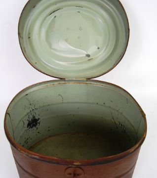 An  Oval Tin Hat Box, 12”/30cm wide, 9.5”/24cm tall. POSTAGE: Worldwide postage / delivery available on all items. Combined postage available; UK £15.99+VAT, Ireland from £19.99+VAT, Europe from £19.99+VAT, USA / Canada from £30+VAT. Any other destinations please get in touch for a quote; info@eastbristol.co.uk. All quotes dependant upon location. Prices are per parcel (not per item).
