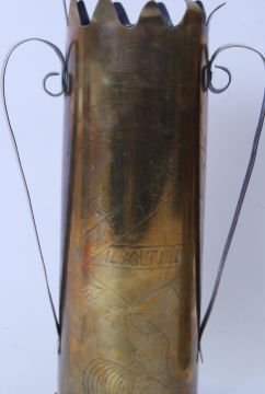A pair of WWII Second World War Trench art style shells. Each with decorative brass handles and engraving for 'Liberation' and 'Souvenir'. 31cm tall.  POSTAGE: Worldwide postage / delivery available on all items. Combined postage available; UK £15.99+VAT, Ireland from £19.99+VAT, Europe from £19.99+VAT, USA / Canada from £30+VAT. Any other destinations please get in touch for a quote; info@eastbristol.co.uk. All quotes dependant upon location. Prices are per parcel (not per item).