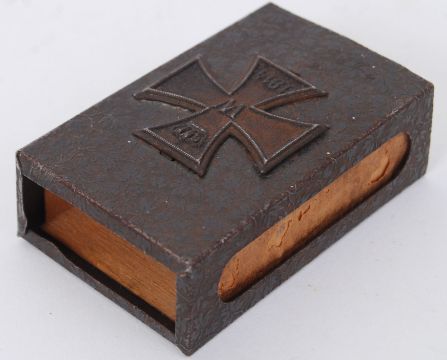 An unusual believed period WWI Imperial German decorated matchbox holder (with miniature Iron Cross to front). The matchbox opens to reveal a miniature diorama believed to be of Hitler's cabin in the mountains. Unusual, very decorative. 6.5cm long.  POSTAGE: Worldwide postage / delivery available on all items. Combined postage available; UK £15.99+VAT, Ireland from £19.99+VAT, Europe from £19.99+VAT, USA / Canada from £30+VAT. Any other destinations please get in touch for a quote; info@eastbristol.co.uk. All quotes dependant upon location. Prices are per parcel (not per item).