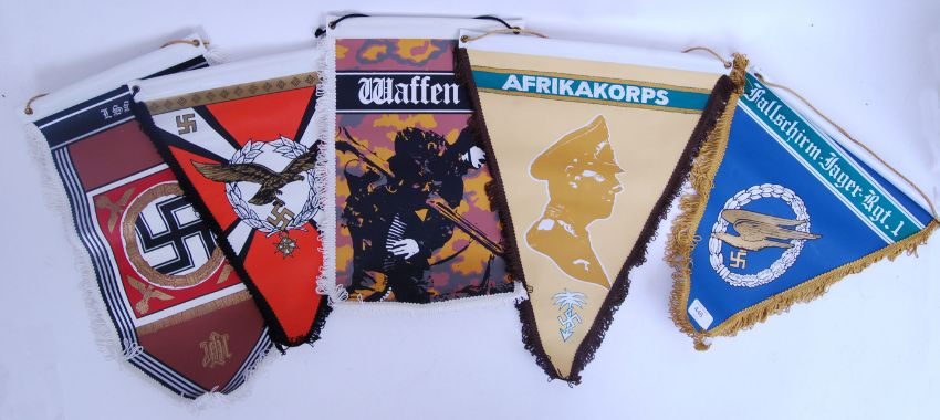 A collection of 20th century Nazi / Third Reich related vinyl pennants / flags. Each different, to include Fallschirm Jager, Arikakorps, Waffen SS and two others. Largest being 50cm tall. POSTAGE: Worldwide postage / delivery available on all items. Combined postage available; UK £15.99+VAT, Ireland from £19.99+VAT, Europe from £19.99+VAT, USA / Canada from £30+VAT. Any other destinations please get in touch for a quote; info@eastbristol.co.uk. All quotes dependant upon location. Prices are per parcel (not per item).