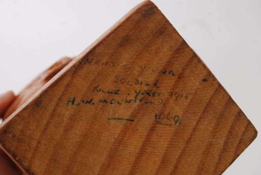 A World War One carving of solider killed at Ypres in 1918. Includes faded writing to the base saying 'Head of a young solider killed at Ypres 1918, H W'. 1969 and 20cm tall.   POSTAGE: Worldwide postage / delivery available on all items. Combined postage available; UK £15.99+VAT, Ireland from £19.99+VAT, Europe from £19.99+VAT, USA / Canada from £30+VAT. Any other destinations please get in touch for a quote; info@eastbristol.co.uk. All quotes dependant upon location. Prices are per parcel (not per item).