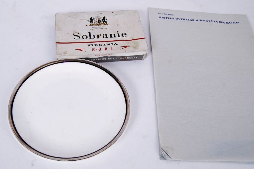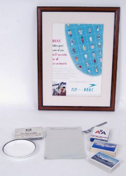 A collection of commercial aircraft memorabilia to include BOAC Sobranie Virginia Metal Cigarette Tin; BOAC Form No. 96343; Britannia Airways Playing Cards; Monarch Airlines Playing Cards; American Airlines Playing Cards; British Airways Royal Doulton Side Plate EC1043, Fine Bone China; a British Airways Fork by Arthur Price, approx. 6"/15cm and a framed 1950’s ‘Fly BOAC’ advert.  POSTAGE: Worldwide postage / delivery available on all items. Combined postage available; UK £15.99+VAT, Ireland from £19.99+VAT, Europe from £19.99+VAT, USA / Canada from £30+VAT. Any other destinations please get in touch for a quote; info@eastbristol.co.uk. All quotes dependant upon location. Prices are per parcel (not per item).