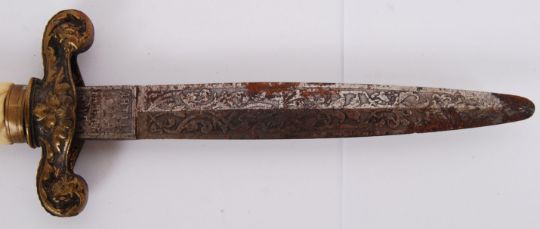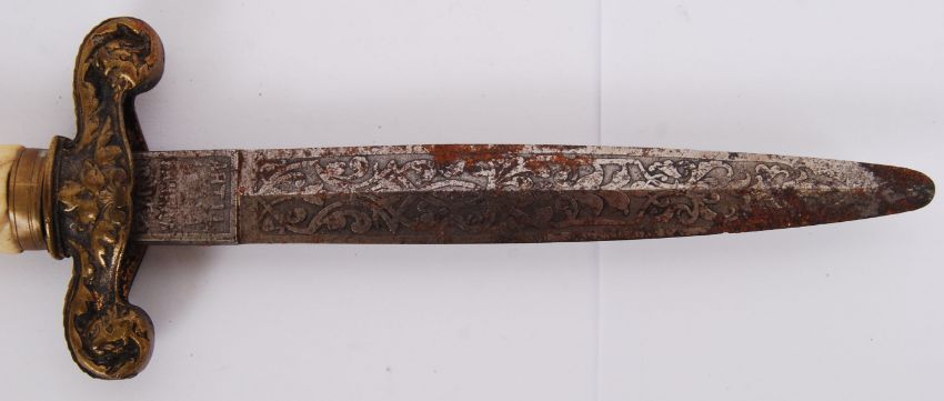 A late 19th / early 20th century bone handled patterned blade Spanish dagger. Crown to top of the handle. Markings worn, but ' Artil Fabrica' appears to recasse. 29cm long  POSTAGE: Worldwide postage / delivery available on all items. Combined postage available; UK £15.99+VAT, Ireland from £19.99+VAT, Europe from £19.99+VAT, USA / Canada from £30+VAT. Any other destinations please get in touch for a quote; info@eastbristol.co.uk. All quotes dependant upon location. Prices are per parcel (not per item).