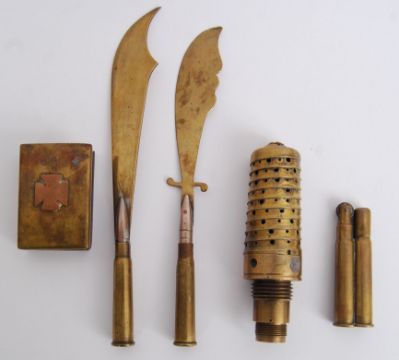 A collection of mostly WWI First World War Trench art and related pieces. To include a fuse, matchbox holder, letter openers, lighter. x5 items total. POSTAGE: Worldwide postage / delivery available on all items. Combined postage available; UK £15.99+VAT, Ireland from £19.99+VAT, Europe from £19.99+VAT, USA / Canada from £30+VAT. Any other destinations please get in touch for a quote; info@eastbristol.co.uk. All quotes dependant upon location. Prices are per parcel (not per item).
