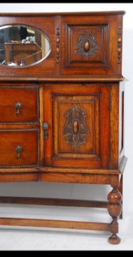An early 20th century Edwardian oak mirror back sideboard with ornate carvings with a run of drawers above cupboard doors opening to reveal shelved interior. Measures: 136cms high x 152cms wide x 56cms deep.