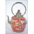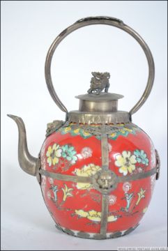 A Chinese ceramic and white metal embellished teapot. The ceramic pot with fu dog masks to the banding, arched handle with fu dog embellished lid. Measures: 19cms high.