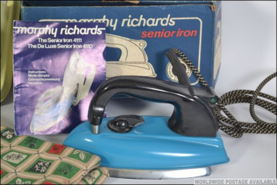 A group of vintage / retro mid 20th century items ti include a boxed Morphy Richards Iron, a boxed Metal Maid Iron Tidy and a hand made tea cosy.