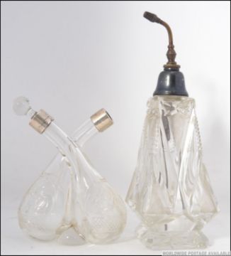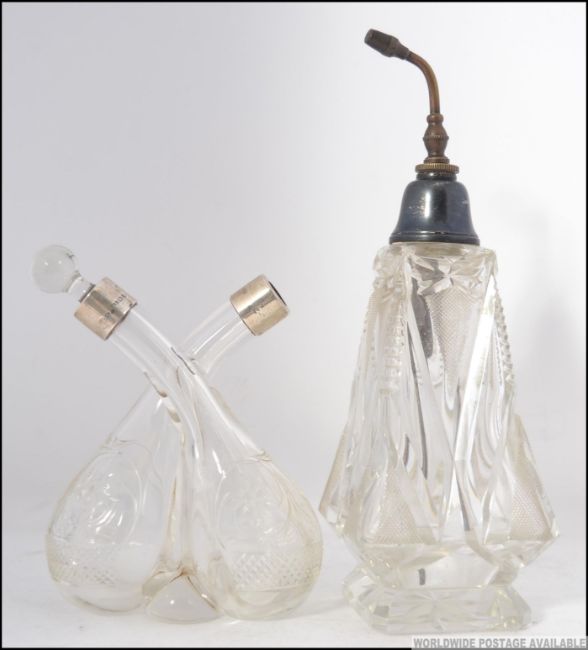 A silver and cut glass twin perfume bottle being intertwined together with a silver and cut glass ladies perfume atomiser bottle. Hallmarks for John Grinsell & Sons, Birmingham, the other unmarked. Together with a leather cased medicine glass from the 19th century. Measures: 20cms high.