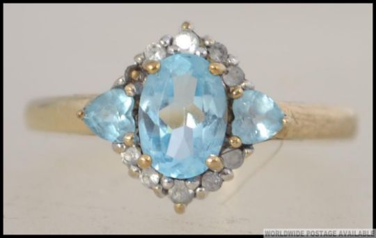 A hallmarked 9ct gold ring set with pear shaped blue topaz surrounded by white stones. size N / O. Gross weight 2.2G