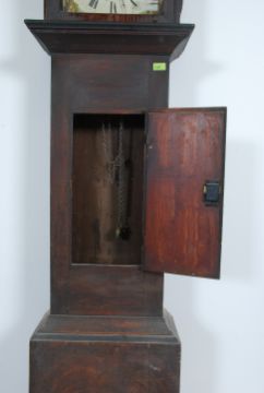 A 19th century oak painted face longcase clock by Major of Cheltenham. The clock with oak hood and trunk complete with a pendulum and single brass weight