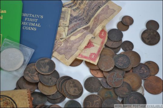 A collection of old bank notes and coins to include Great Britain Penny - 1858 Queen Victoria, 1890 Victorian jubilee bust crown. Notes to include Dutch, Japanese, Italian,etc. Coins to inc commemorative, 2002 five pound coin, £ coin, £1 note £1 coin and 50p's. Also Victorian penny's, Georgian 18th century coins, silver shillings, maundy money,1899 half crown, silver Victoria four pence,