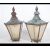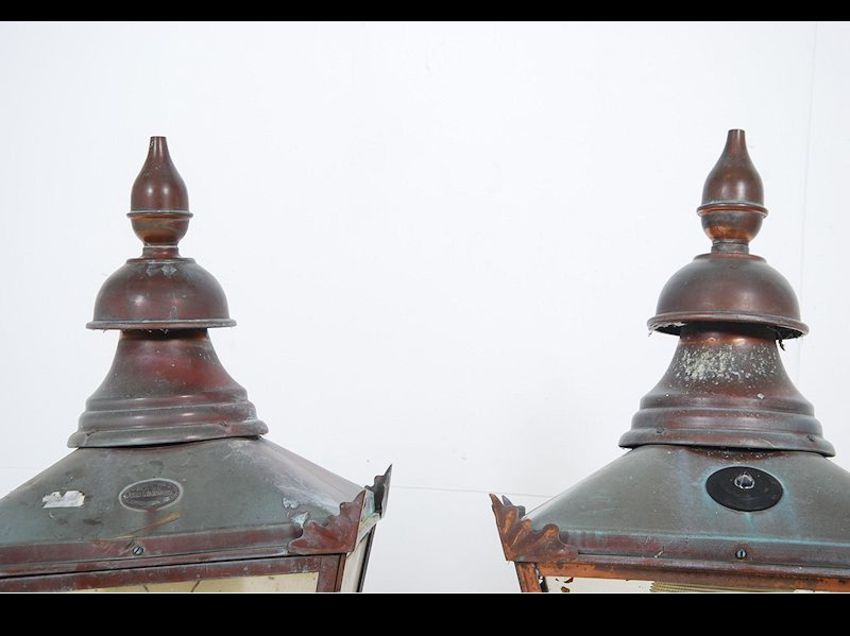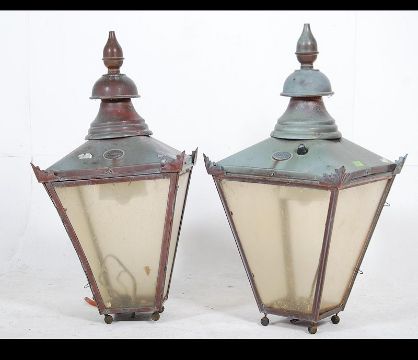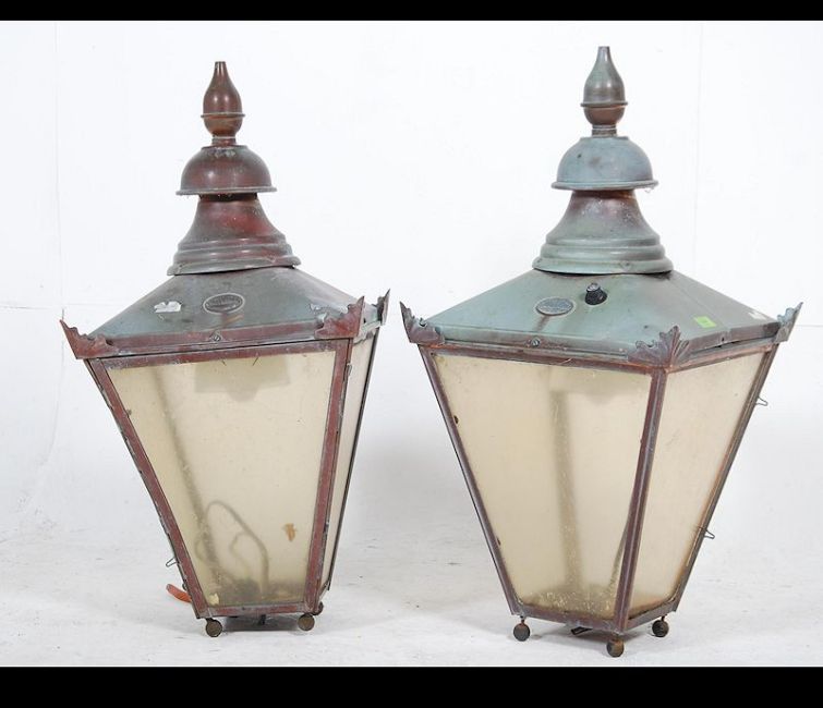 A pair of early 20th century large copper street lantern lights. Copper frames with finial tops marked for DW Windsor No 287 Hoddesden Herts. Measures; Height 86cm x Width 44cm x Depth 44cm.