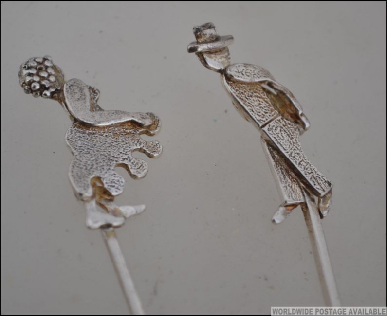 A pair of believed Christian Bauer Danish silver 925 twizzle cocktail stick having twist stems with maiden and gentleman tops. Measures: 16cms long.