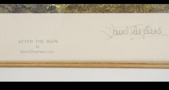2 framed and glazed limited edition David Shepherd prints ' After The Rain ' 272 / 850 signed by the artist in pencil along with ' An African Landscape ' 868 / 950. Measures: 38cms high x 69cms wide.