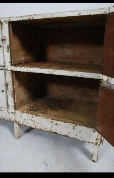 A good mid century Industrial metal cupboard / cabinet with brass screws to the metal top and frame with unusual wooden 4 door facia. Measures 92cms high x 134cms wide x 42cms deep.