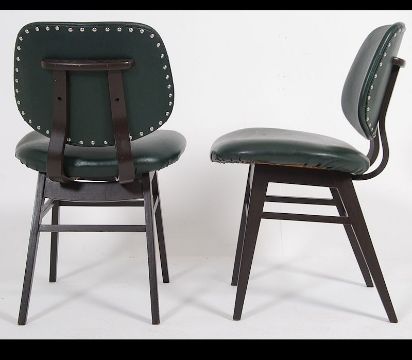 A set of 4 1950's green vinyl upholstered dining chairs in the manner of Benchairs being raised on tapered legs. Measures: 85cms high x 52cms wide x 60cms deep.