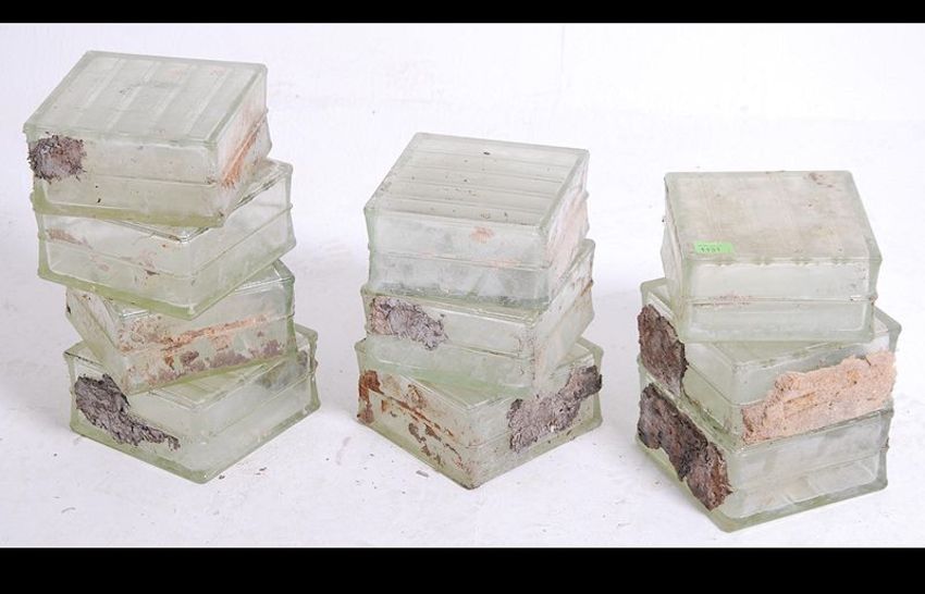 A collection of ten 20th century reclaimed glass bricks the bricks having a ripple effect finish. Measures: 20cms high x 20cms wide x 10cms deep.