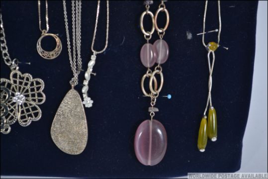 A good group of 10 costume jewellery necklaces to include silver 925 examples all mounted on a cloth board.