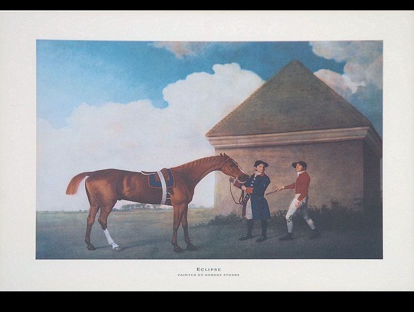 A series of 3 framed and glazed horse racing prints to include 2 by John Frederick Herring ' Lottery & Touchstone ' along with a George Stuart ' Eclipse ' , each mounted with notation. Measures: 22cms high x 31cms wide each.