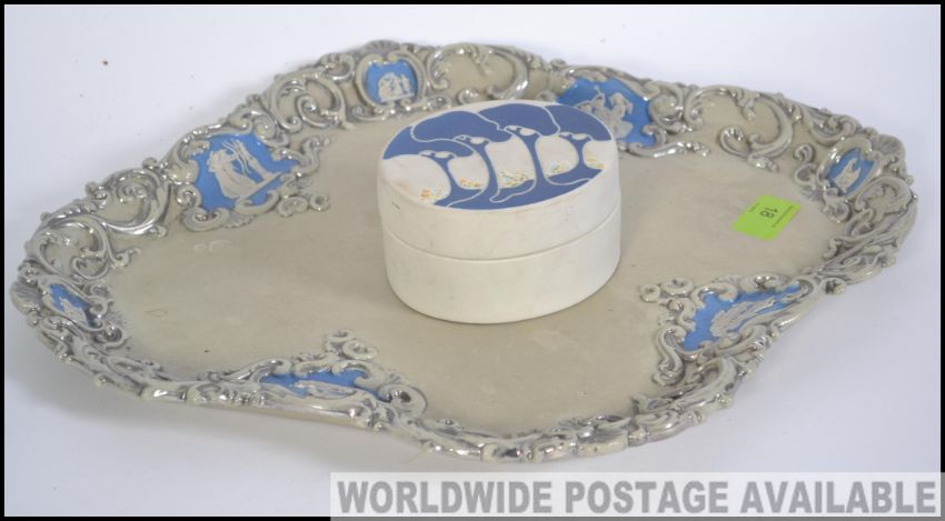 A 20th century continental Wedgwood Jasperware style tray along with an Art Deco influenced lidded pin dish. Measures: 42cms wide.