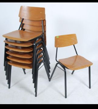 A set of retro mid century beech wood panel seat stacking chairs from a school / factory workroom. Each raised on tubular metal supports. Measures: 75cms high x 44cms wide x 50cms deep.