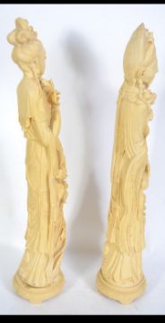 A pair of tall molded plaster figures of Chinese origins of male and female form. The lady with lotus flowers and the man with a young child. Measures: 67cms high.