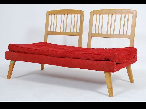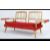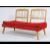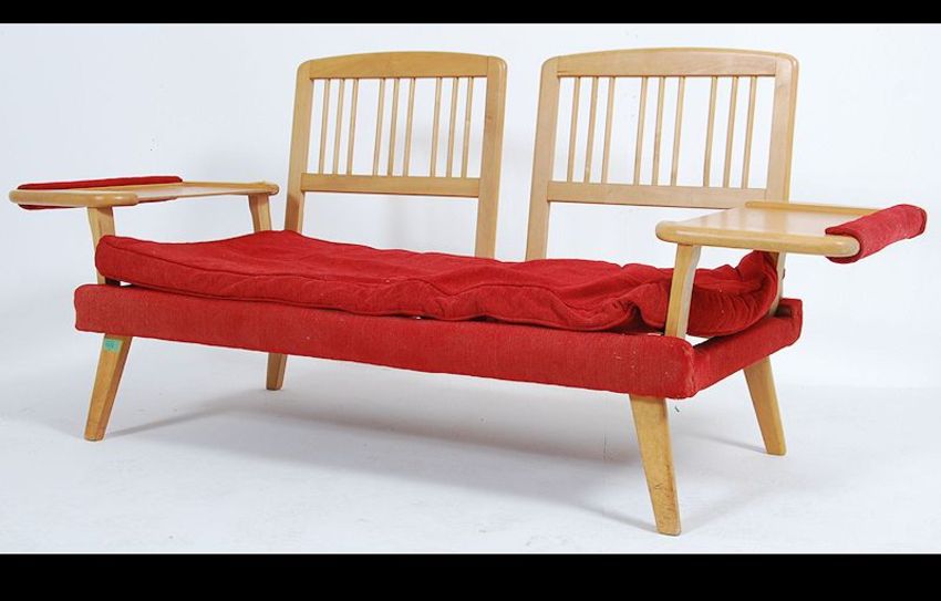 A 1950's retro mid century two seat sofa settee raised on tapered legs with unusual table elbow rests, Upholstered in a red fabric. Measures: 77cms high x 167cms wide x 70cms deep.