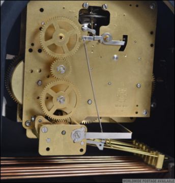 A mid century napoleons hat oak mantel clock by St James of London having silvered dial with Westminster chime movement. Measures: 46cms wide.