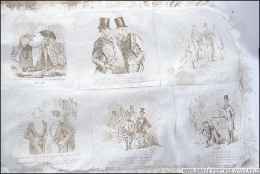 A beautiful hand made silver white metal threaded silk panel with foliate design together with a Dickensian panel worked table cloth with differing scenes and notation.