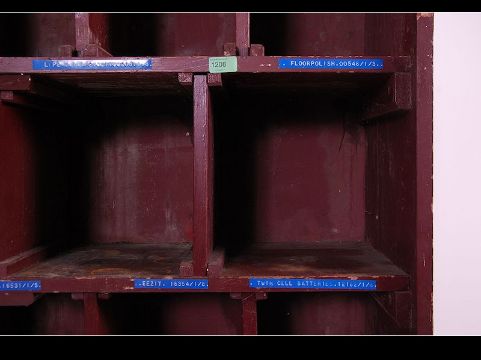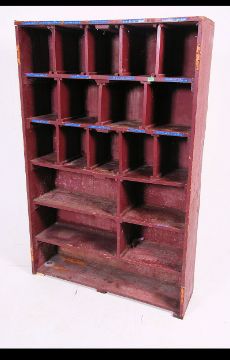 A vintage industrial mid 20th century painted pine store parts pigeon hole cupboard having notation for various parts still attached. With the original paint finish. Measures: 185cms high x 120cms wide x 46cms deep.