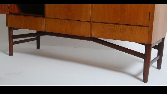 A retro 20th century teak wood sideboard in the manner of Gordon Russel having chamfered top above three drawers with three doors below opening to reveal shelved interior. Raised on shaped legs united by stretchers. Measures: 83cms high x 140cms wide x 48cms deep.